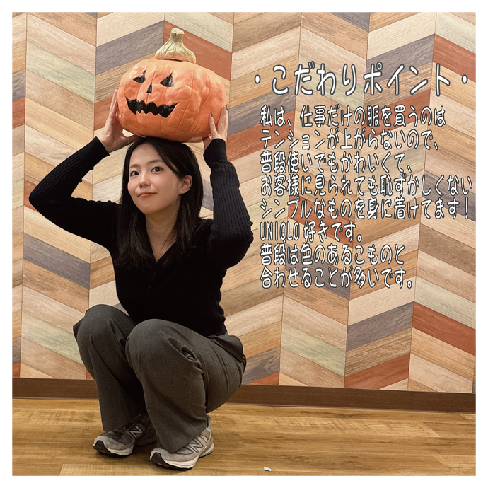「私は、仕事だけの服を買うのはテンションが上がらないので、普段使いでもかわいくて、お客様に見られても恥ずかしくないシンプルなものを身に着けてます!
